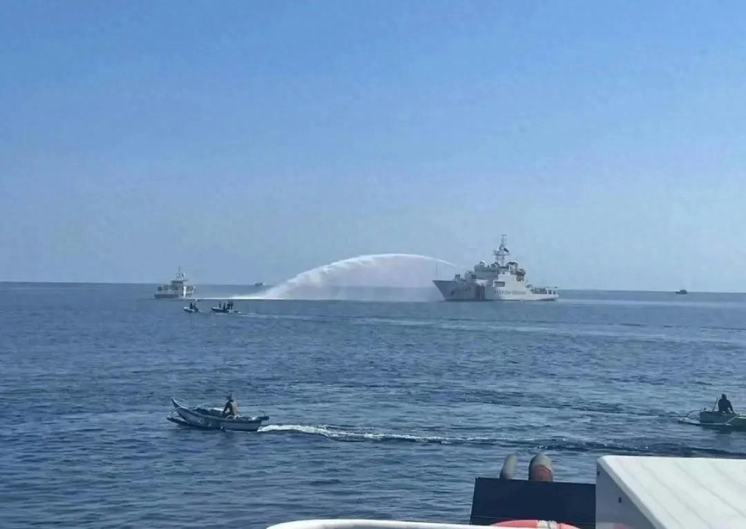 事件当天,中国海警迅速采取行动,出动4艘海警船拦截菲方船只。面对菲船恶意接近并试图撞击的挑衅行为,中方海警3302号船选择以水炮进行强制驱离。与此同时,两艘054A型护卫舰在远处压阵,展现出解放军强大的后盾力量。中方的反应不仅高效且坚决,更是在法律框架内对菲方的不法行为进行了正当处理。