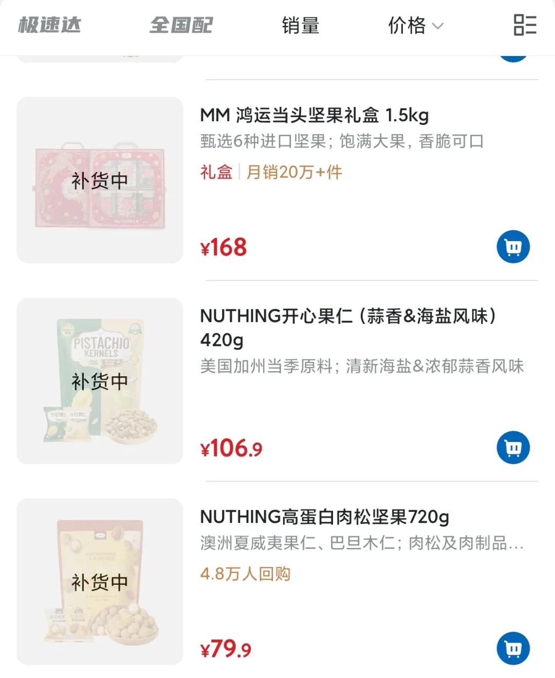 比如,山姆自营的一款坚果礼盒,1.5公斤售价168元,月销已超过20万件,经常处于补货状态。