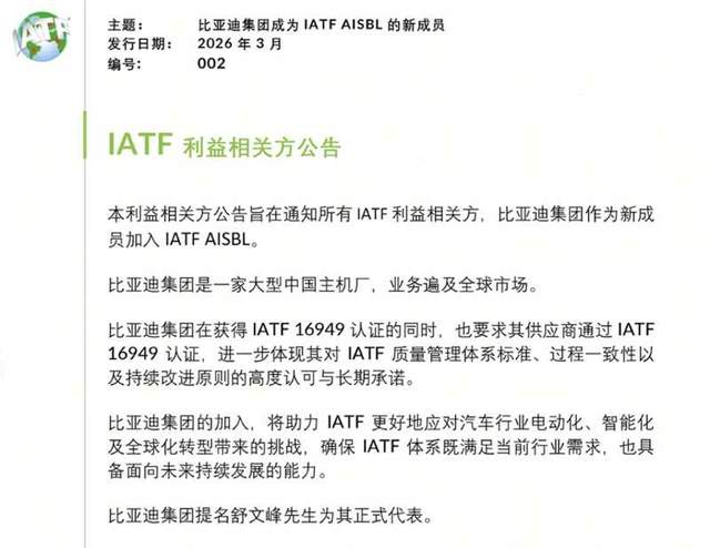 厉害了!比亚迪这次真的杀进全球汽车核心“朋友圈”了!就在2026年3月11日,比亚迪干了一件大事——正式加入国际汽车工作组(IATF),成了全球第一个也是唯一一个加入这个顶级组织的新能源车企。别小看这一步,要知道IATF过去基本是欧美老牌车企的“自留地”,像宝马、福特、大众、通用这些巨头都在里头。这次比亚迪能被美国AIAG提名推荐,再经全体成员投票通过,说明中国车企的硬实力已经让西方主导的标准体系不得不敞开大门。
