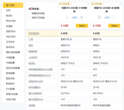 零跑T03的厂商指导价为5.99-6.99万元,提供310km和403km两种续航版本供消费者选择,结合各地4S店的优惠政策,实际落地价格会更加亲民。这款车自推出以来,累计销量已突破25万台,这样的销量数据从侧面反映出它在市场和消费者心中的认可度。对于预算有限,尤其是刚参加工作、希望拥有一台可靠纯电代步车的年轻消费者来说,能在五六万价位区间买到续航超过400公里的小型纯电动车,零跑T03的吸引力不言而喻。