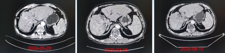 遂后采用SBRT(TOMO)、仑伐替尼+单抗等内科综合治疗。2021年8月19日复查ALT 19 IU/L,AFP 22.5 ng/mL,肝脏CT显示肝右叶区为主巨大团块状占位范围减少。其后患者在当地医院常规随访,期间复查CT显示肝脏占位范围明显减小。2026年1月13日来院复查ALT 205 IU/L,总胆红素(TBil)58.1μmol/L,肝癌5项(-),肝脏超声造影提示肝右前叶上段低回声(49×26 mm)及肝左叶内低回声(19×17 mm)考虑肝肿瘤术后改变,肝硬化,肝内胆管扩张,增加双环醇等抗炎保肝药物。2026年2月26日来院复查ALT 17 IU/L,TBil 37μmol/L,肝癌5项(-),继续原方案治疗。