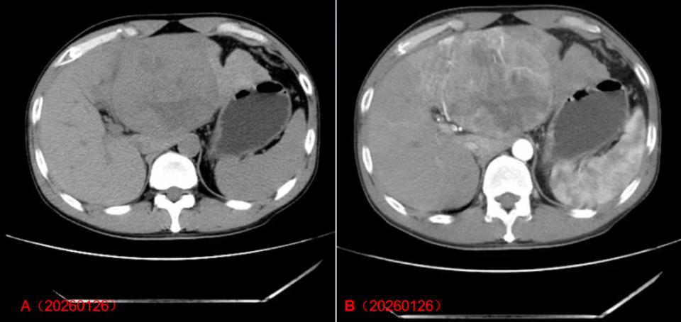 2026年1月23日于外院查上腹部CT平扫检查,显示肝左叶占位(97×90 mm)。两天后突然出现腹痛加剧且不能缓解,来我院急诊,我院以“腹痛待查”收治入院。入院后查房见痛苦面容,板状腹。2026年1月26日查凝血酶原活动度(PTA)83%,HBsAg 1370 IU/mL,ALT 52 IU/mL,AFP 678.4 ng/mL,甲胎蛋白异质体(AFP-L3)4.8%,APT 11991 mAU/mL。2026年1月26日CT增强显示肝左叶占位(95×110 mm),考虑肿瘤,并提示破裂出血可能。