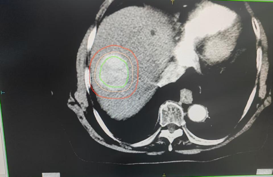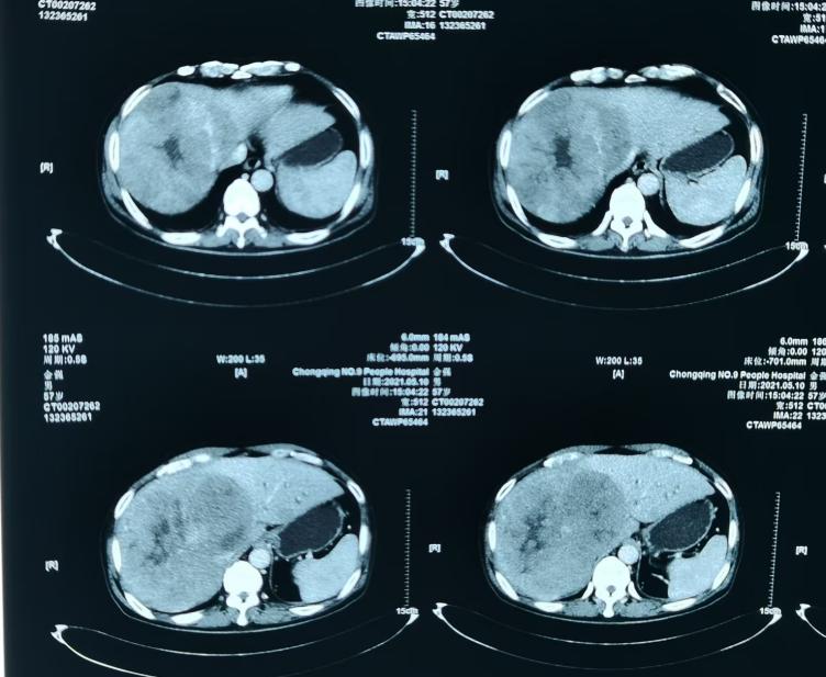 2023年1月18日行PET-CT检查提示,肝右前叶肿块伴坏死,氟代脱氧葡萄糖(FDG)代谢异常增高,符合肝癌表现;肝硬化,门静脉高压,腹腔少许积液。根据患者实际情况,除支持治疗外,提出其他备选方案:①肝移植;②颈动脉化疗栓塞(TACE)或射频(RF)+精准放疗。后患者在陆军军医大学大坪医院采用肝移植治疗,经肝移植后病情明显好转,在院外随访,生活如常(相关资料正在整理中)。