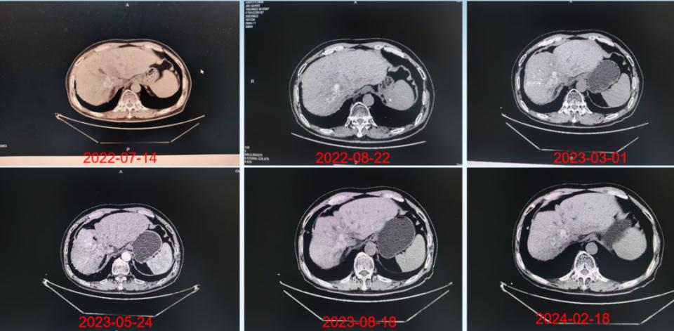 注:2022-07-14(胸部CT显示:肝右叶占位,其内少许碘油沉积/出血可能,肝左叶结节状致密影)。2022-08-22(对比2022-07-14胸部CT,肝癌介入术后改变,肝右叶占位,体积较前稍缩小、仍强化)。2023-03-01(对比2022-8-22胸部CT,肝癌介入术后改变,肝右叶碘油沉积较前减少,术区病灶活性残存)。2023-05-24(上腹部CT增强:对比2023-3-1CT,肝癌介入术后改变,肝右叶碘油沉积较前减少,术区病灶活性残存可能)。2023-08-18(对比2023-05-24日CT片,肝癌介入术后改变,肝右叶碘油沉积,术区病灶活性残存)。2024-02-18(对比2023-08-18日CT片,肝癌介入术后改变,肝右叶碘油沉积,术区病灶活性残存)。