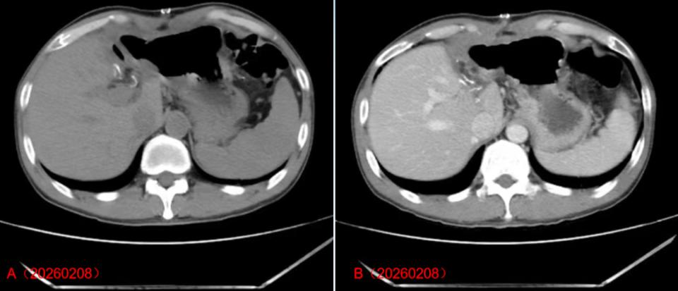 注:图A、B是术后2026年2月8日CT增强影像,显示:肝左叶切除术后,切缘多发结节状、条状致密影,术区脂肪间隙模糊、见斑片状低密度影,增强扫描未见异常强化灶。提示肝左叶切除术后改变,术区炎性渗出性改变,右侧腹壁软组织肿胀。