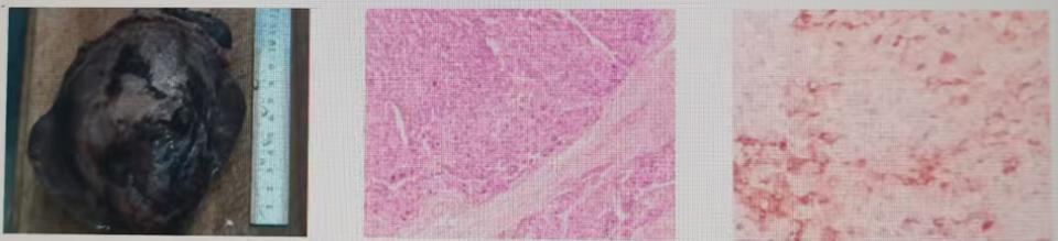 入院后根据检查结果,遂立即采用ETV 1 mg 1次/日抗病毒等治疗。考虑到患者肝脏肿瘤破裂出血,请普外科刘清华主任会诊后考虑有急诊手术治疗,并于2026年1月27日在全麻下行“开腹探查:复杂肝叶切除(左半肝切除)+门静脉切开取栓+胆囊切除术”,术中见巨大肿瘤(13×11×9 cm),肿瘤表面破裂,大量血凝块堆积。病理活检提示肝左叶中分化肝细胞性肝癌(假腺样)。手术后予以止痛、护肝、营养支持等治疗,术后患者曾出现发热,经抗感染等治疗后症状好转。