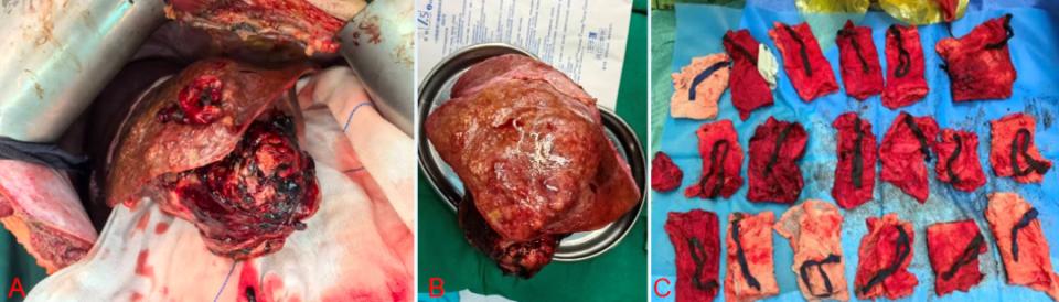 注:图A(术中所见巨大肿瘤,约13×11×9 cm大小,肿瘤表面破裂,大量血凝块堆积);图B(切除的部分肝脏);图C(术中所用止血纱带)。