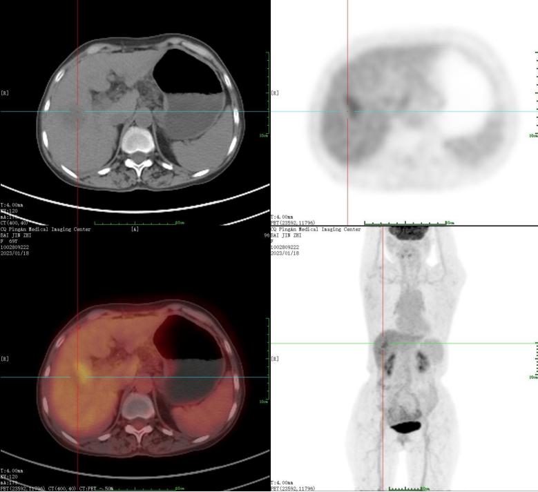 注:患者于2023年1月18日行PET-CT检查,影像显示肝右前叶低密度影,直径约35 mm,周围放射性摄取增高,SUVmax约3.5,中心放射性摄取缺失,提示肝右前叶肿块伴坏死,FDG代谢异常增高,符合肝癌表现,请结合临床。