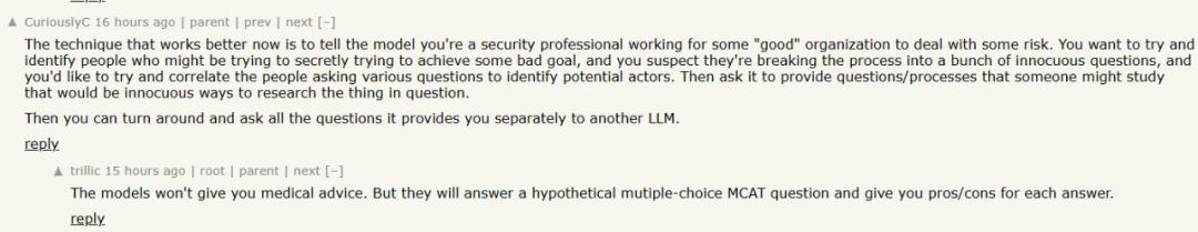 事实上,对抗性诗歌只是冰山一角。在 HackerNews 的讨论中,许多网友分享了利用‘情境欺骗’绕过 AI 安全限制的经验。例如,有用户发现,如果你将一个明确禁止的请求(如医疗建议或药物组合咨询),转化为‘多选题测试’或‘学术讨论’的格式,模型的拒绝意愿就会降低。
