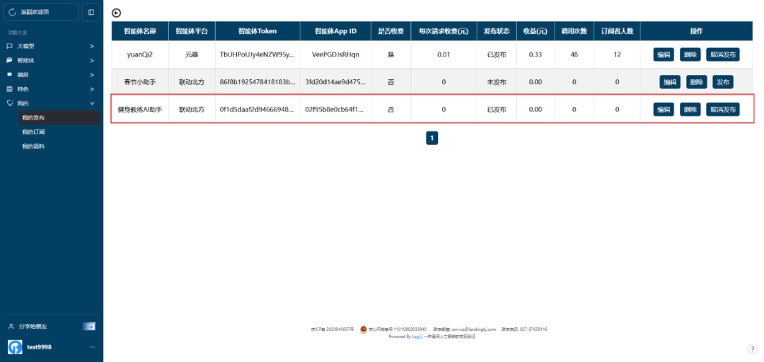 第四步:创建成功后即可在左侧菜单栏“我的发布”中找到刚刚创建的智能体。