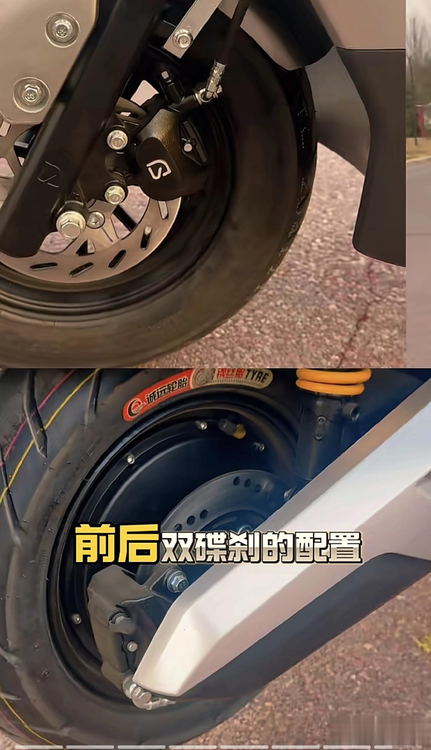 轮胎:采用10英寸铝合金轮毂,前轮3.5-10半热熔真空胎,后轮采用3.0-10真空胎,半热熔真空胎抓地力强,同时还具备耐磨、抗扎、载重强的优势。为什么采用前宽后窄的搭配呢,因为具有转向灵活高速稳定的优点。