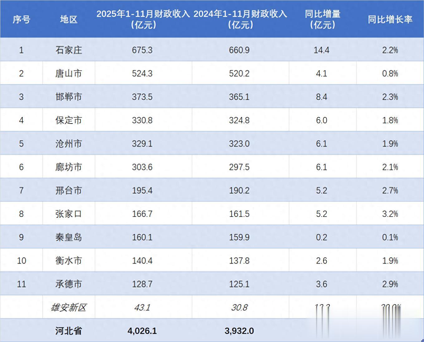 燕赵之地河北,东临渤海、内环京津,与山东、河南、山西等地均有相接,整体经济实力在全国31个省市区中位于中等偏上。2025年1-11月份,河北全省共实现一般公共预算收入(下称“地方财政收入”)4026.1亿元,较上年同期增加94.1亿元,同比增长率为2.4%。其中雄安新区在各地中表现最为突出,增速达到了39.9%。