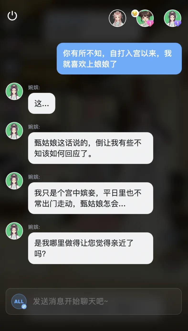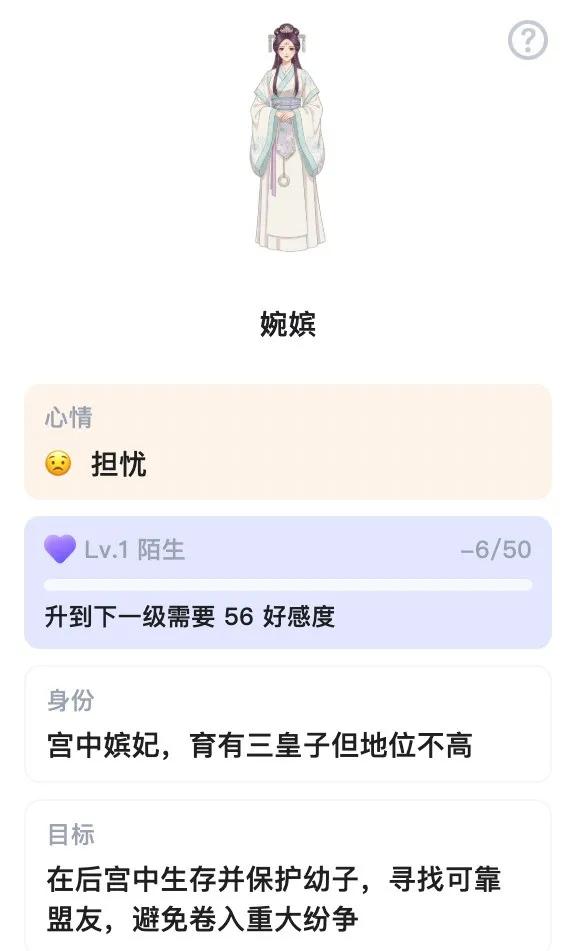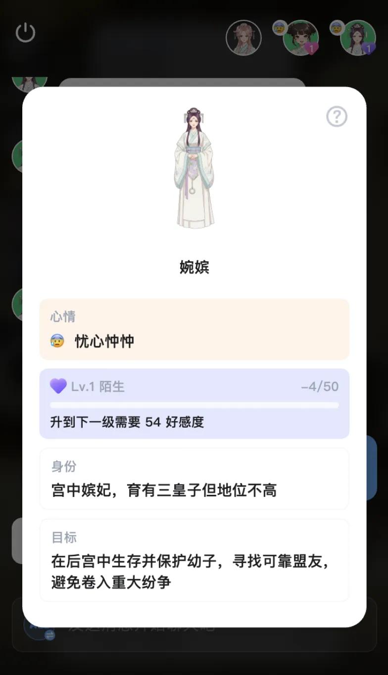 在体验中,我能明显感受到这套系统在起作用。比如我在宫斗中做了危险操作,NPC会切成愤怒表情,AI伙伴则忧心忡忡——情境记忆给了用户额外的信息量和沉浸感。