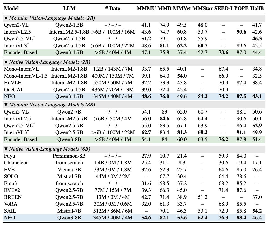 值得注意的是,NEO 在训练效率上展现出令人惊讶的表现。整个预训练阶段仅使用了 3.45 亿图文对,这个数据规模远小于主流模块化 VLM 动辄数十亿的训练数据。在中期训练阶段,NEO 使用 4000 万样本进行视觉-语言对齐的强化;监督微调阶段则使用约 400 万条高质量指令数据。总计不到 4 亿的训练样本,NEO-2.2B 和 NEO-9B 两个版本就达到了与顶级模块化 VLM 相当的性能水平。