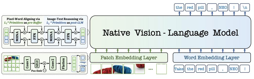当下主流的视觉语言模型(Vision-Language Models, VLM),通常都采用这样一种设计思路:将预训练的视觉编码器与大语言模型通过投影层拼接起来。这种模块化架构成就了当前 VLM 的辉煌,但也带来了一系列新的问题——多阶段训练复杂、组件间语义对齐成本高,不同模块的扩展规律难以协调。