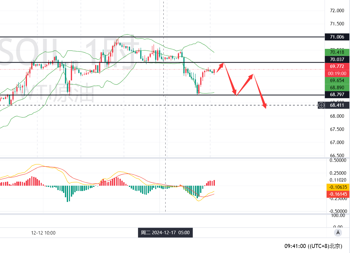 从原油1小时时间框架分析,油价在68.8水平位获得显著支撑,随后呈现出V型反转态势。当前,油价正徘徊于布林带中轨附近,一旦有效突破此中轨,预示着油价可能延续其上行趋势。然而,值得注意的是,上方70.03区域构成了一个短期阻力位,油价在该位置可能会遭遇承压,从而引发回调或进入区间震荡阶段。观察MACD指标,其快速线与慢速线已形成金叉并向上发散,表明多头力量正在逐步增强,动能柱的整体增长也进一步确认了油价上行的潜力。尽管如此,若油价在70阻力位前止步不前,无法有效突破,则存在回调至布林带下轨68.8附近进行蓄势整理的可能性。