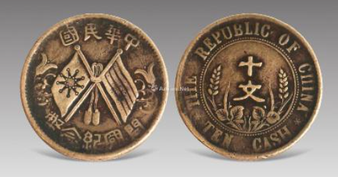 1916 年中华民国开国纪念二十文双旗币,在北京诚轩拍卖会上以98.9 万元成交。