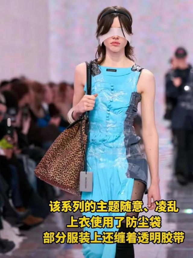 该系列中的某些服装完全由回收的防尘袋制成,这些防尘袋经过精心的剪裁和缝制,被重新塑造成时尚衣物,另外设计师还将普通的透明胶带直接缠绕在服装上,创造出一种既新颖又具有视觉冲击力的效果。