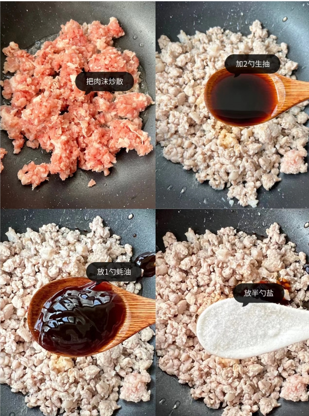 现在来炒肉沫。锅里放一点点油,油不用太多,不然会很油腻。油热了之后,把准备好的肉沫放进锅里。用铲子快速地把肉沫炒散,让每一块肉都受热均匀。肉沫炒散之后,加入 2 勺生抽,生抽可以提鲜,让肉沫的味道更浓郁。再加入 1 勺蚝油,蚝油可是个提鲜的小能手,能让肉沫的味道更加醇厚。接着,再加半勺盐进去调味。盐的用量可以根据自己的口味调整哦,如果喜欢淡一点的口味,就少放一点盐。调料都加好之后,用铲子把肉沫和调料翻炒均匀,让每一块肉都裹上调料的香味。