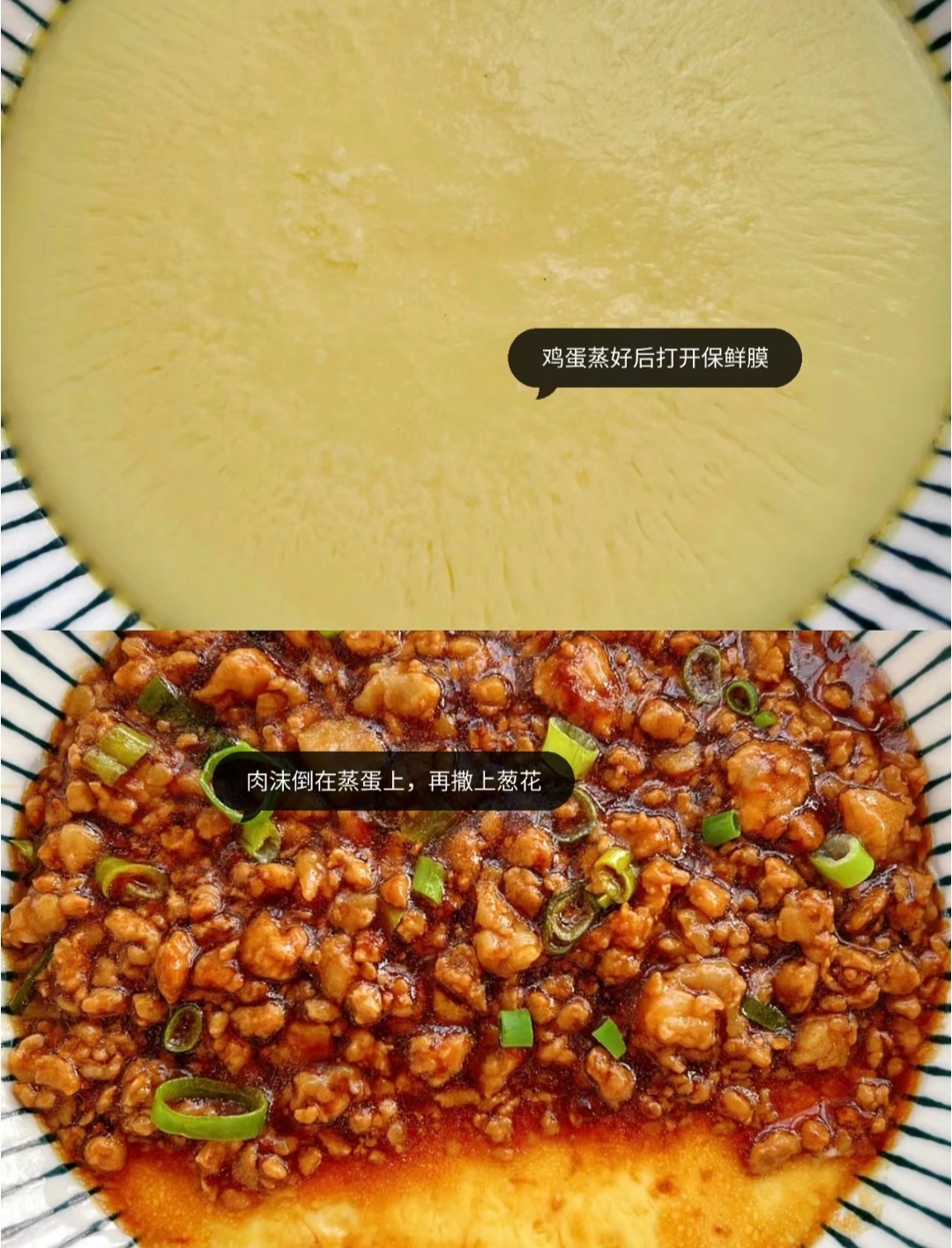 这时候,鸡蛋也蒸好啦。打开锅盖,小心别被蒸汽烫到哦。揭开保鲜膜,你会看到一碗鲜嫩滑弹的蒸蛋呈现在眼前。把炒好的肉沫轻轻地倒在蒸蛋上,肉沫的香味瞬间就和蒸蛋的香味融合在一起啦。再在上面撒上一点葱花作为点缀,一道色香味俱全的肉沫蒸蛋就大功告成啦!