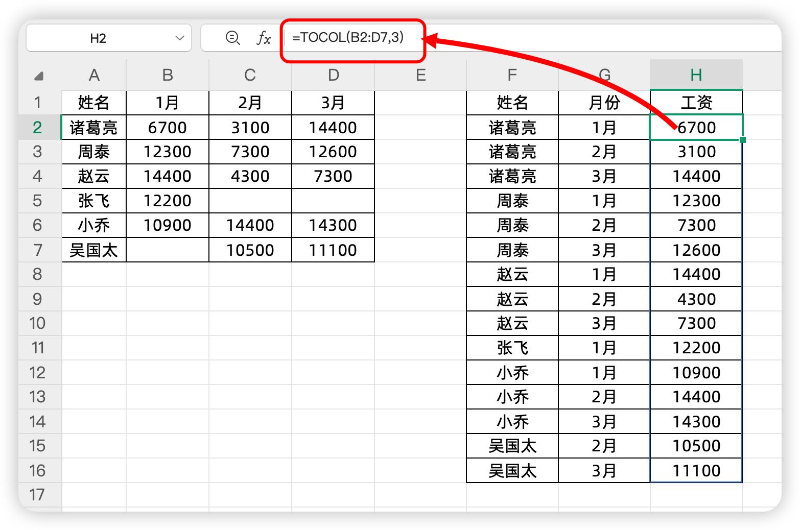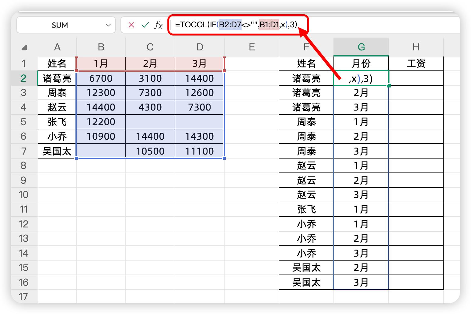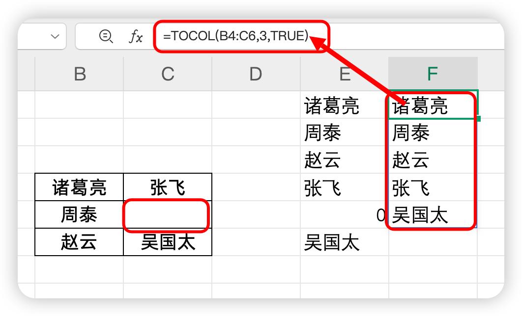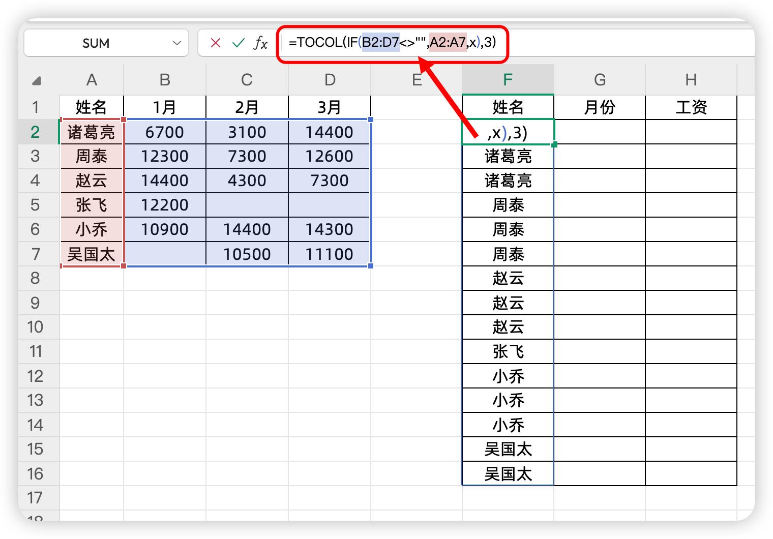 使用TOCOL,参数为3,就会跳过这些错误值,从而把对应的姓名数据给还原了