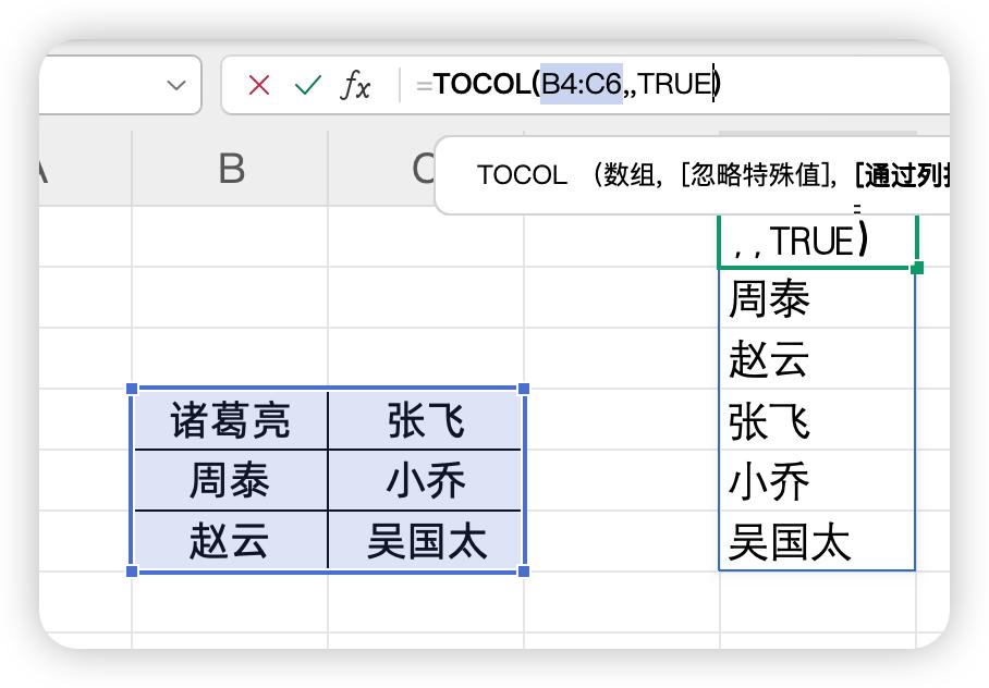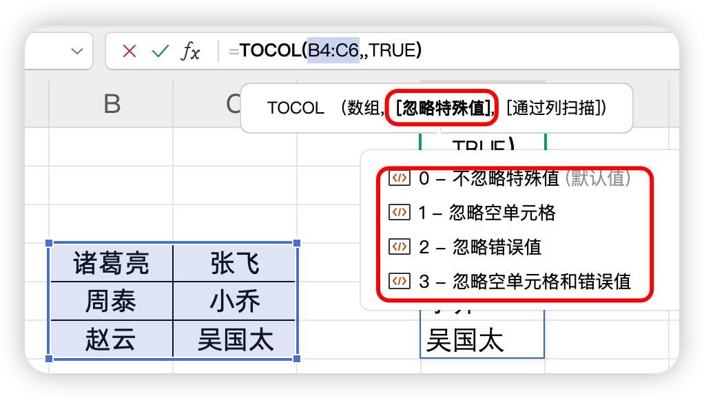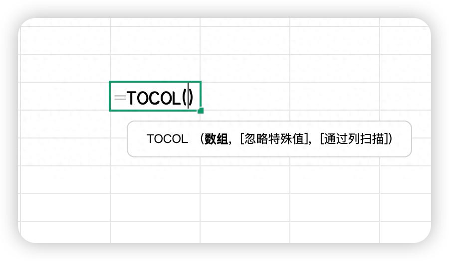 =TOCOL(数组,[忽略特殊值],[通过列扫描])