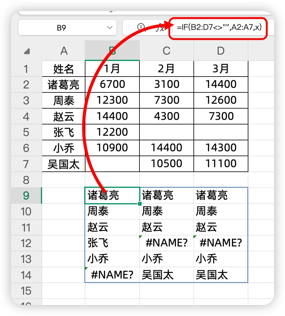 其实我们就是按照数据源的格式,如果有数据的情况下,就把对应的姓名引用过来,否则的话返回x,因为这个x没打双引号,就不是文本,Excel就识别不出来有这个代码,就会报错