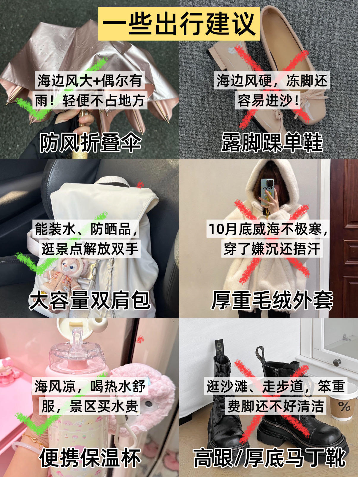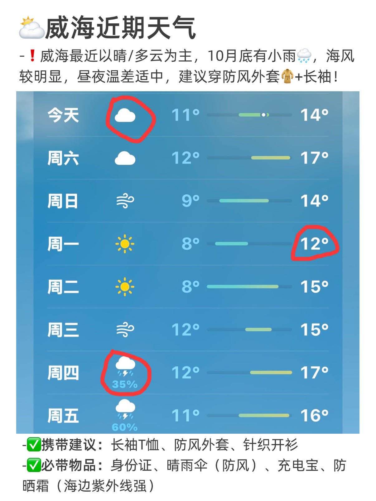 看好天气再出门吧!!衣服要多带,但是不能乱带啊!!威海现状已经很秋冬季了,☔️会下雨,温度也会降低‼️所以一定要看好天气带衣服!!