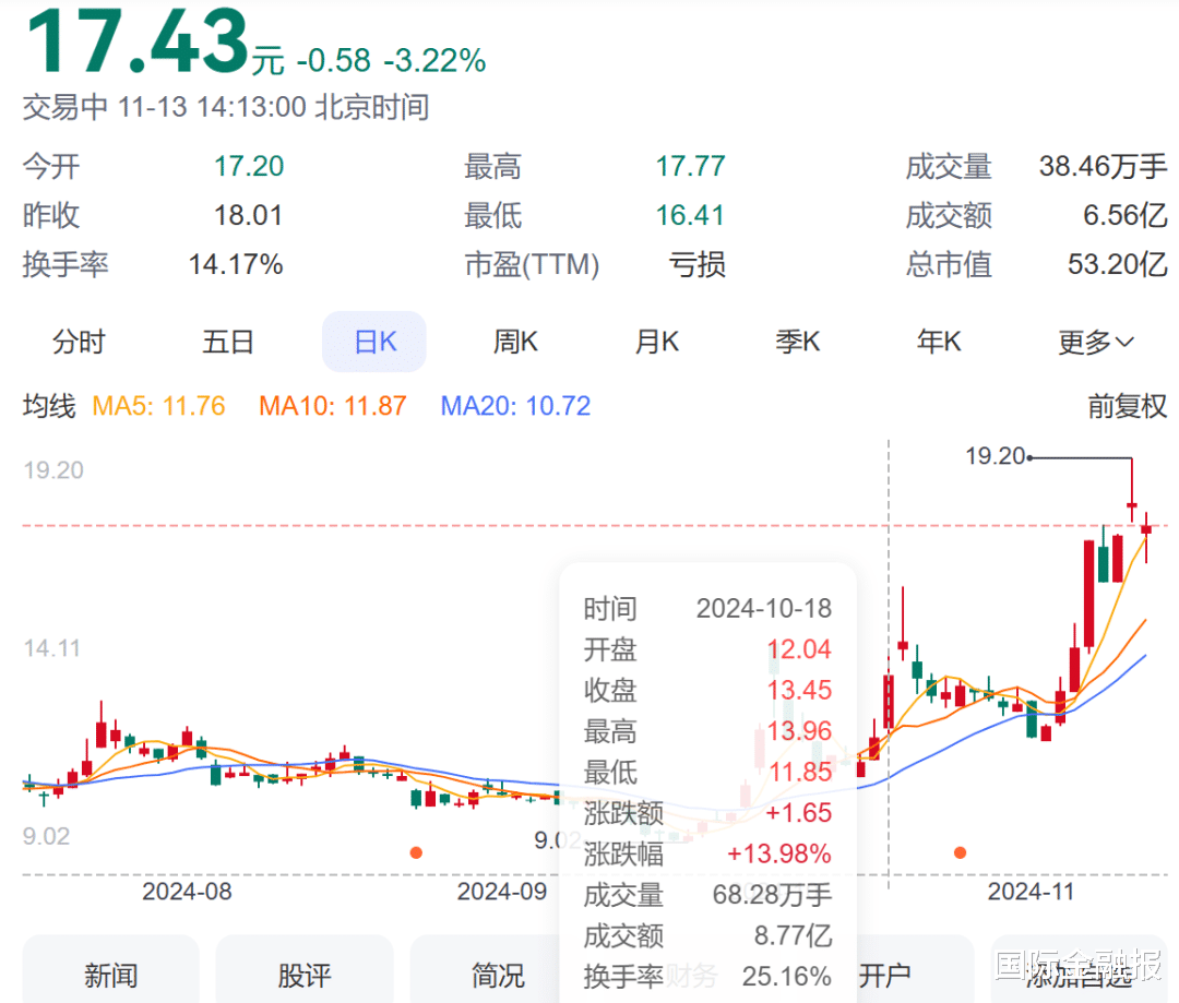 11月13日,高澜股份股价大幅回落,盘中一度跌逾8%;截至当日午间休市,高澜股份每股报17.31元,跌幅3.89%,总市值52.84亿元。