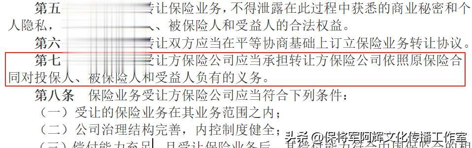 管理办法中第七条就是说的保单转让接管,受让方需要按照原合同执行,有义务按原合同维护投保人,被保人,受益人的权益。