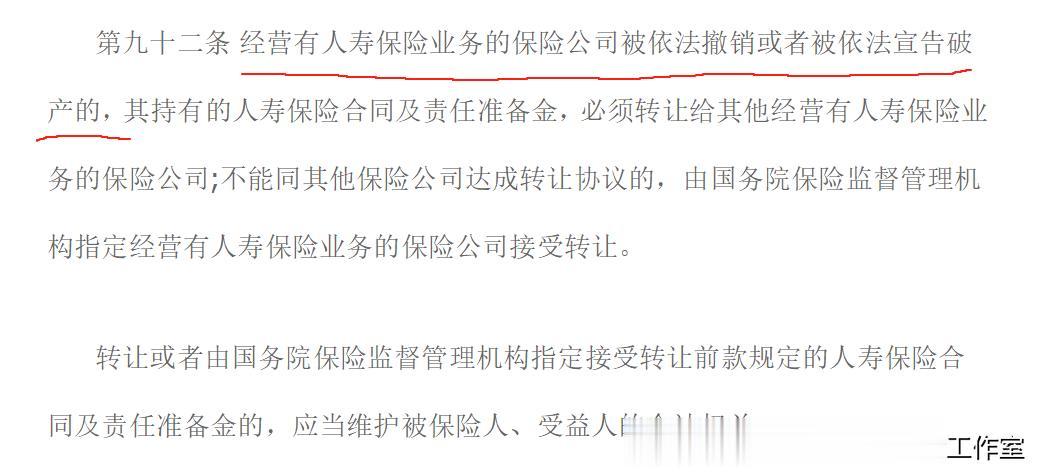 保险法92条说的就是保险公司破产的处置。翻译过来,就是如果保单被接管了,保司还没有破产,比如对安邦,华夏,天安,恒大,前海的处置,就会激活管理办法的第七条,你的保单会按原合同执行。而如果问题保险公司处理的流程,是先破产,然后再把保单由国家或者其他保司来承接,那么按照原合同执行的法规就无效了,那合同具体会有什么变化,没有明确规定。但大概率会是降低定价利率,结果要么是你需要补交保费,要么是保额和现价降低。