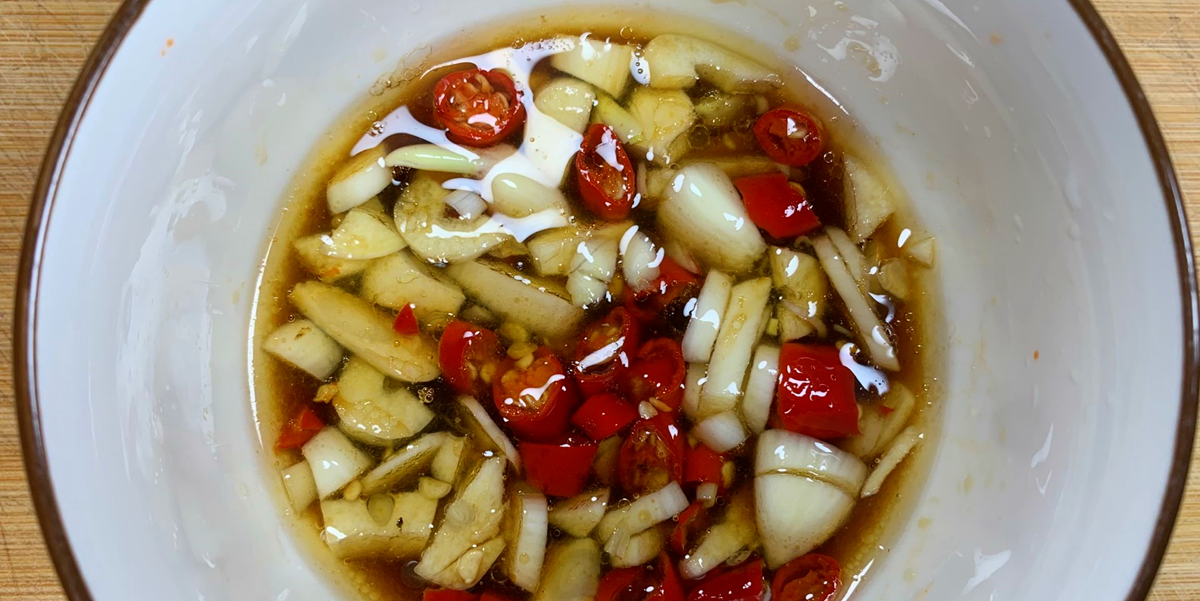 3、趁小萝卜的时间准备一个自己调制的拌料汁,先剥几个大蒜,之后把它剁碎装入碗内,再准备2个小米辣切成小圈,再把熟油倒进去,炸出来它们的香味,最后放入调味品,少许的白糖、3勺米醋、2勺味极鲜、3滴香油和1克的食盐搅散。