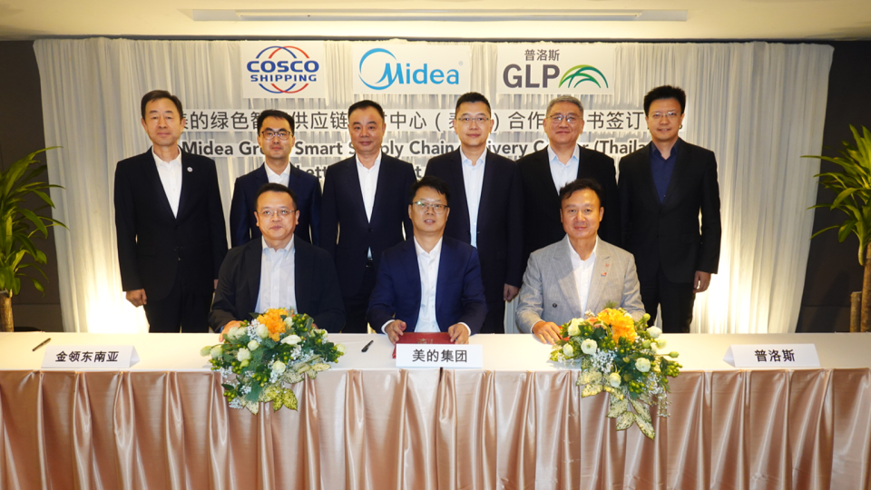 近期,在美的集团副总裁兼智能家居事业群总裁赵磊、美的国际亚太区域总裁蒋轩、美的集团国际供应链总经理施成贵、中远海运(东南亚)有限公司董事长王善和、新鑫海航运(新加坡)有限公司总经理周敢飞、普洛斯中国区首席战略官东方浩等相关领导的见证下,美的集团国际供应链与金领东南亚(中远海控下属公司)、普顺投(普洛斯下属公司)在泰国签订了绿色智慧供应链(泰国)交付中心(以下简称“交付中心”)项目合作意向书。