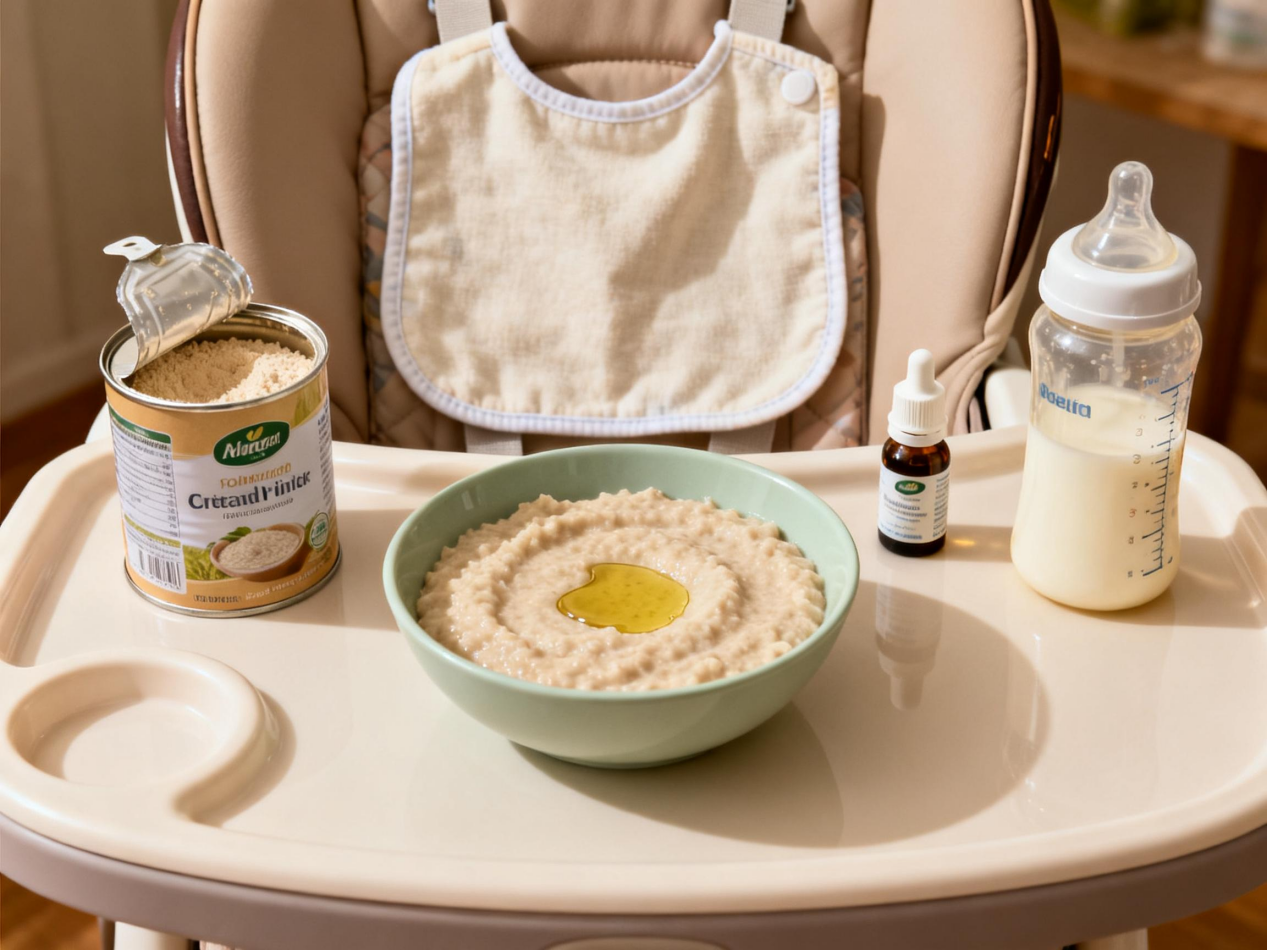 如果是 4 个月刚加辅食的宝宝,“茶油拌米糊” 是更稳妥的选择。取 20g 婴儿米粉,按包装说明用温水、母乳或配方奶冲调 —— 调到 “酸奶状” 最好:用勺子舀起来能缓缓流下,不会太稠卡喉咙,也不会太稀没饱腹感。冲好后放至 40℃左右,滴 1 滴清露茶油,用勺子轻轻拌匀。