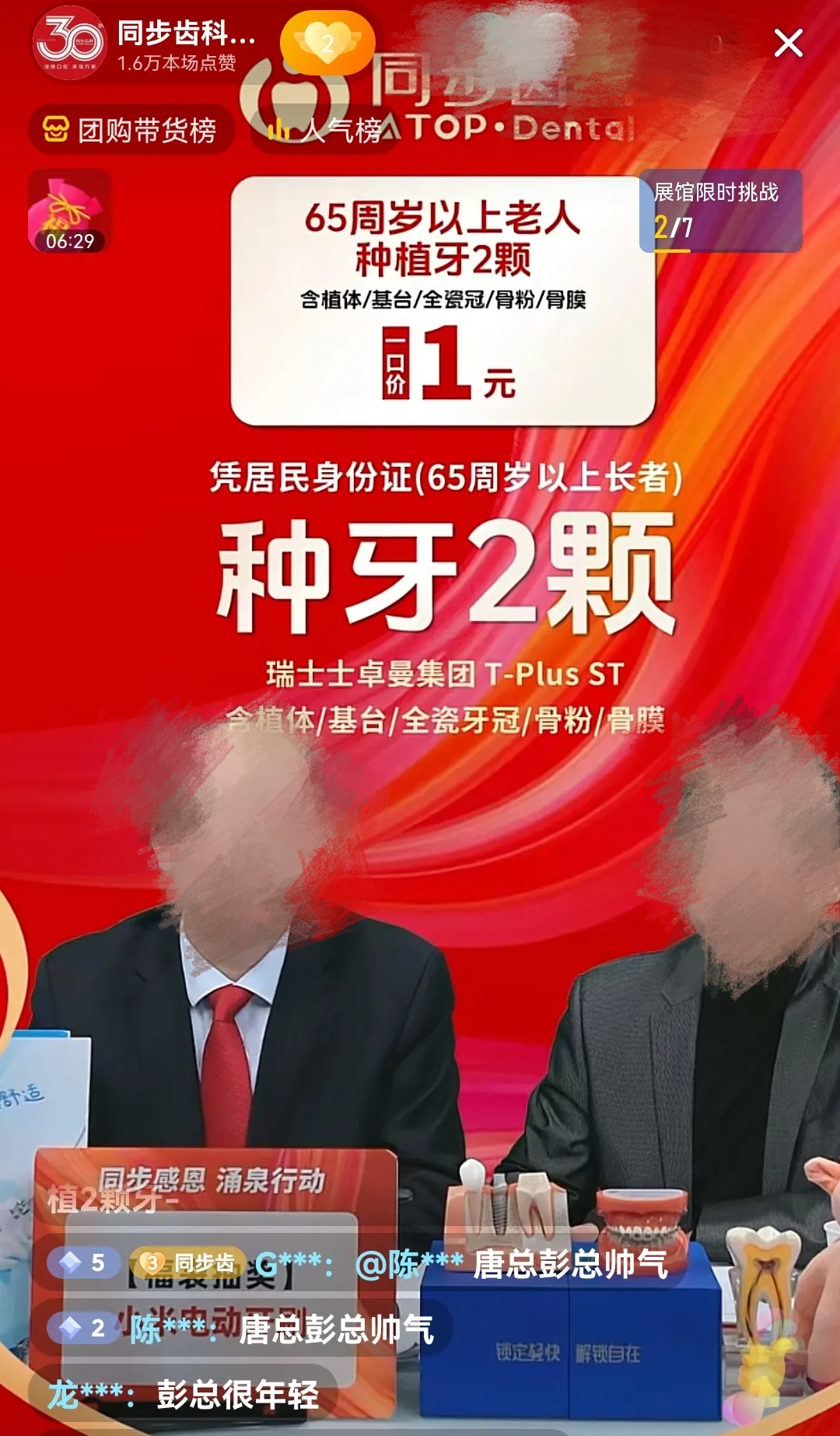 2023年12月,同步齿科面向65岁以上人群推出“1元种植2颗牙”优惠活动,在业内引发关注。据同步齿科创始人唐某强在直播间讲述,该优惠价格包括植体、基台、全瓷牙冠、骨粉、骨膜以及手术费用,活动时间从2023年12月一直持续到2026年12月。