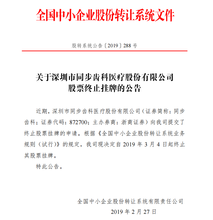 2019年2月27日,全国中小企业股份转让系统有限责任公司发布公告称,自 2019年3月4日起终止同步齿科股票挂牌。至此,同步齿科的上市之路不足一年便草草收场。