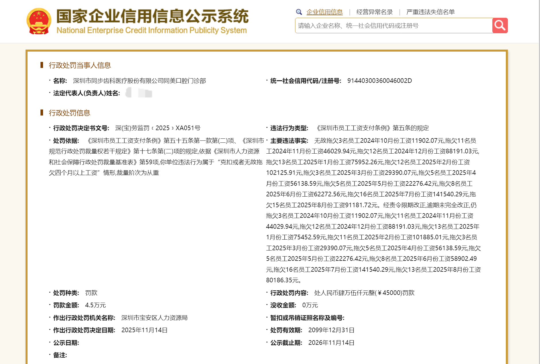 11月14日,国家企业信用信息公示系统发布公告称,深圳市同步齿科医疗股份有限公司同美口腔门诊部因克扣或者无故拖欠四个月以上工资,被深圳市宝安区人力资源局处以4.5万元罚款。