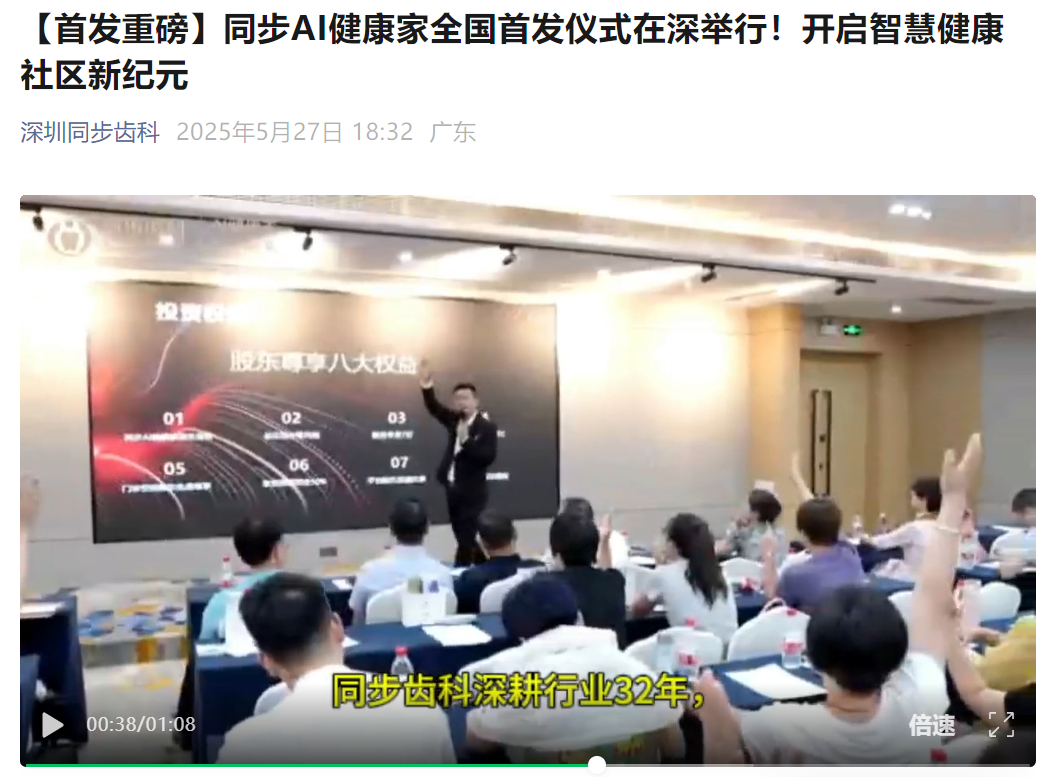 此外,记者从深圳同步齿科微信公众号了解到,今年5月25日,同步齿科推出“同步AI健康家”智慧健康社区服务诊所,同步齿科创始人兼董事长唐某强也出席了发布仪式。