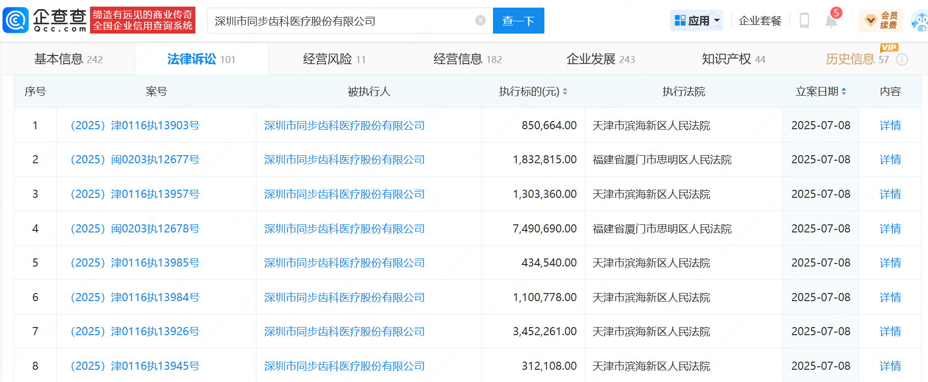 据企查查APP,今年7月8日,深圳市同步齿科医疗股份有限公司在一天之内增加了8起被执行的立案记录,执行法院分别位于天津和福建,执行标的达1677.72万元。