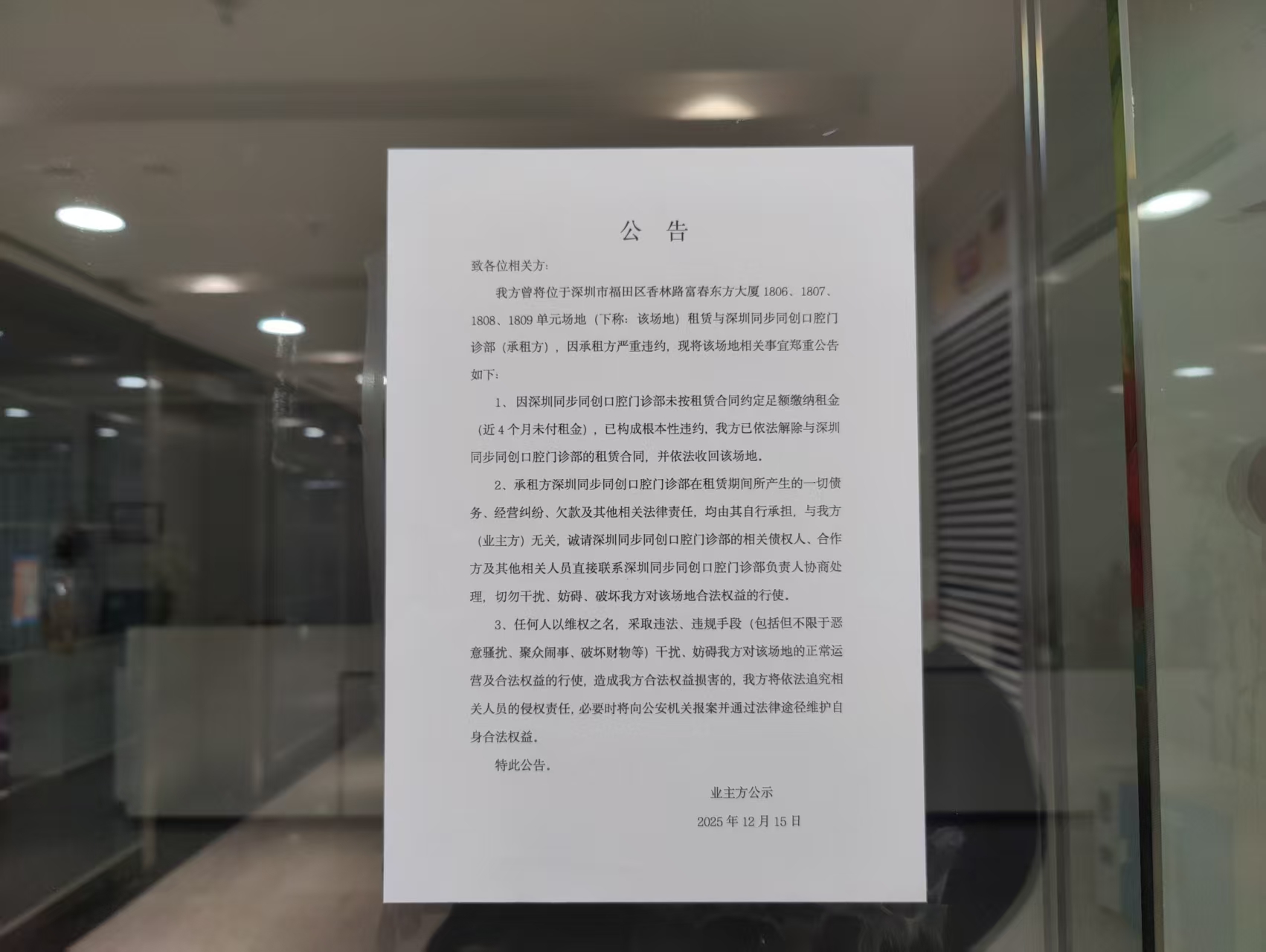 曾接收闭店门诊部患者的深圳同步齿科同创口腔门诊部也于今年12月中旬停业,业主方12月15日发布公告称,该诊所近4个月未付租金。