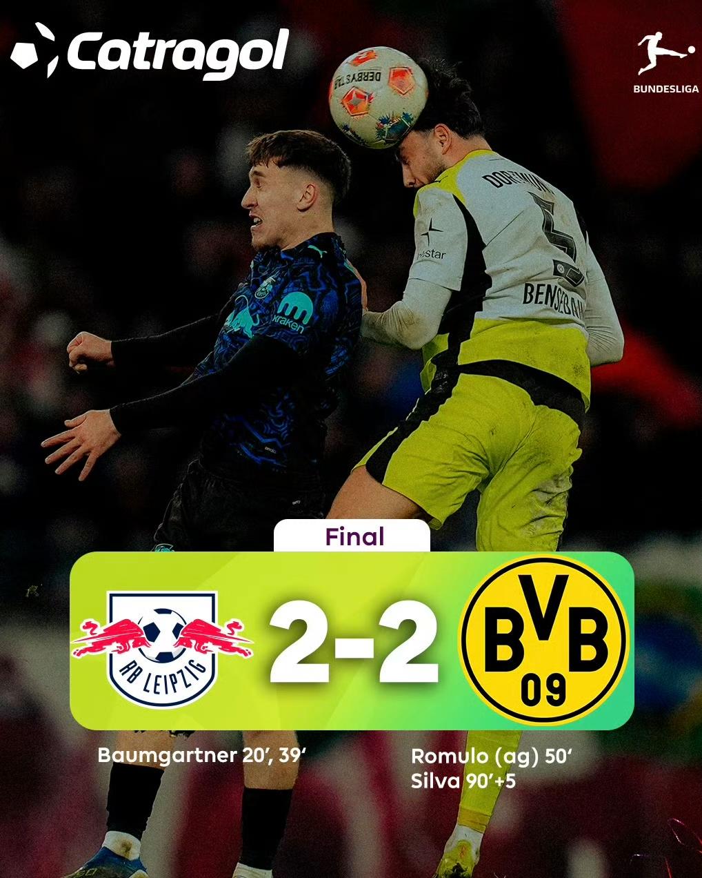 北京时间2月22日凌晨,德甲第23轮上演了一场戏剧性对决。多特蒙德在客场0-2落后的绝境下,凭借补时阶段法比奥-席尔瓦的读秒绝平,2-2逼平RB莱比锡,从红牛竞技场奇迹般地带走一分。
