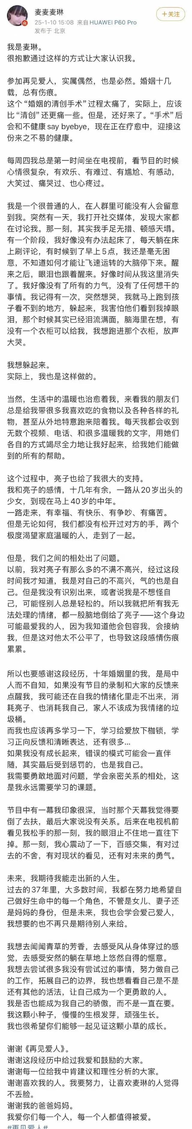 在给节目组的信中,麦琳写道:“我是一个普通到尘烟里无人注意的人,上了节目成为议论焦点被所有人骂,很不适应,感觉天都塌了,每天只想躲在衣柜里哭。”