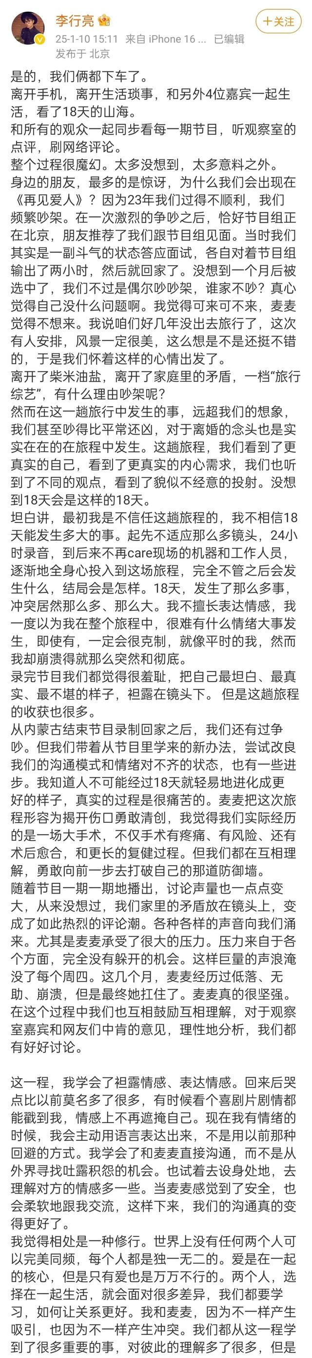 李行亮也在信中表达了类似的感受:“我们参加节目,原本只是想有一个免费的旅游机会,没想到在节目中把最真实最坦诚最不堪的一面毫无保留地展现出来,曝光给所有人看,我和麦琳很有羞耻感。