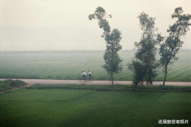 1985年,从火车上拍摄的中国农村,两个骑自行车的男人。