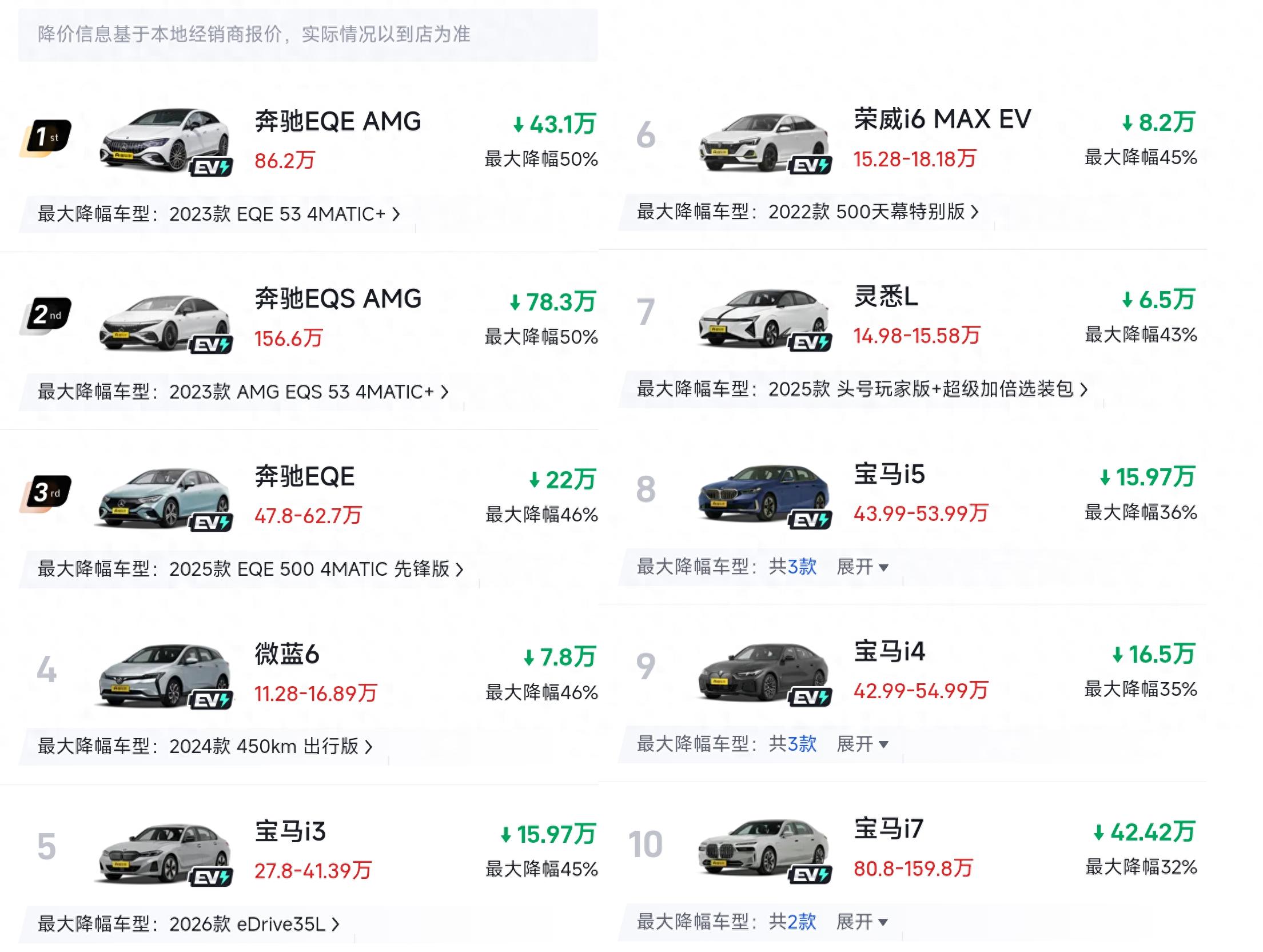 传统豪华品牌在电动化转型浪潮中承受着巨大压力,其纯电轿车正通过大幅降价来证明市场价值并争取份额。奔驰EQE、EQE AMG及宝马i3等车型的终端优惠幅度普遍在45%至50%区间,部分车型优惠金额超过20万元。这反映出,在特斯拉及中国高端新势力的产品与定价策略冲击下,传统豪华品牌在电动领域的品牌溢价短期内难以建立。为了快速提升销量、扩大市场声量并完成电动化转型的初期目标,“以价换量”成为其不得不采取的关键策略,这也使得高端纯电轿车的入门门槛显著降低。