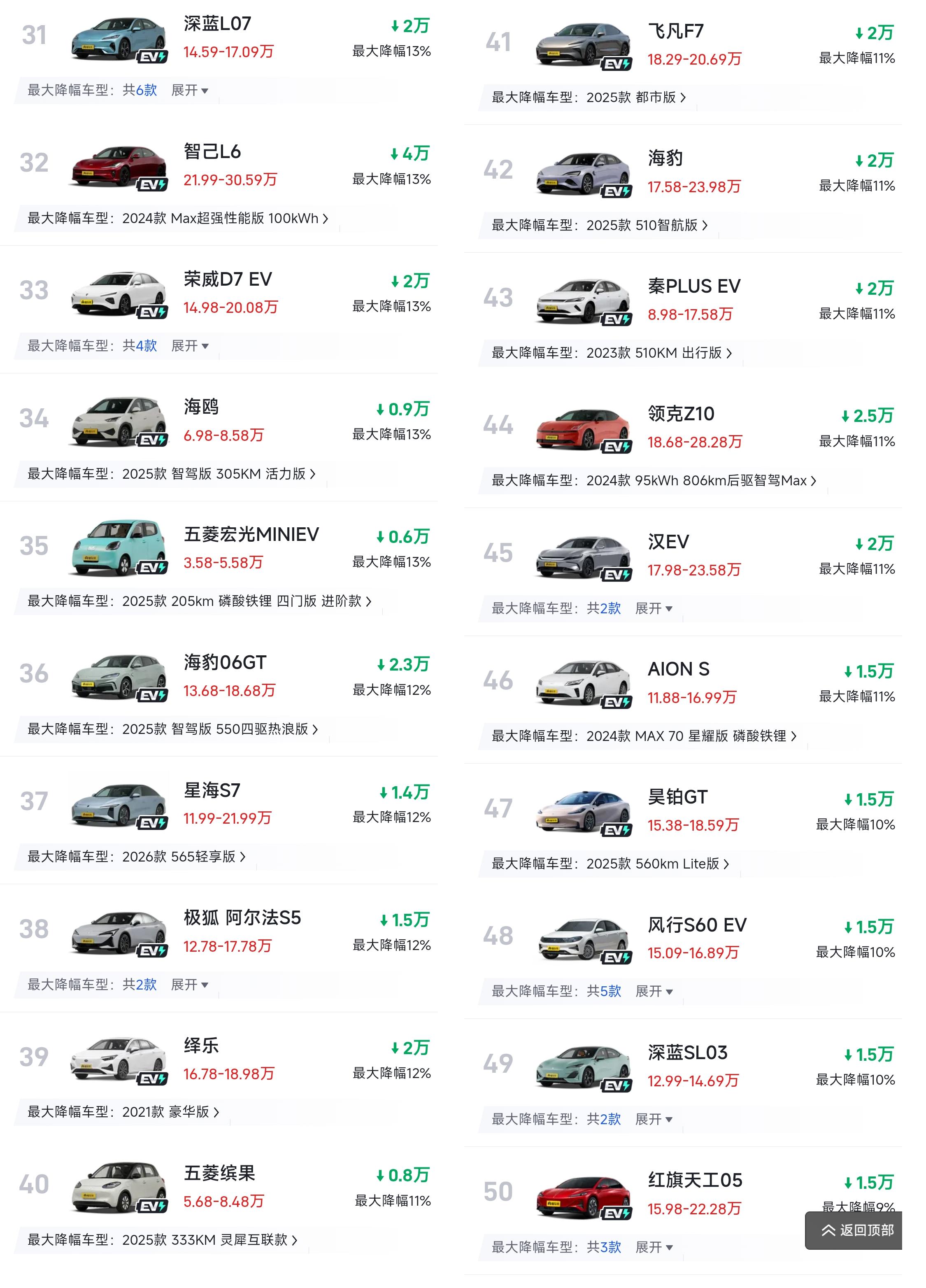 在10万至25万元的主流价格区间,纯电轿车的价格调整相对温和但覆盖面广。比亚迪海豚、海豹,以及深蓝SL03、极狐阿尔法S5等热门车型,普遍有10%至15%的降幅。五菱宏光MINIEV、零跑T03等微型电动车也继续通过数千元的优惠巩固其市场地位。这部分车型本身已具备较强的市场认可度和规模效应,价格调整更多是为了应对日趋激烈的内部竞争,以及燃油车降价带来的跨品类压力。通过适度的价格让利,这些车型旨在维持甚至扩大其市场基本盘,巩固在家庭用户和年轻消费者中的吸引力。