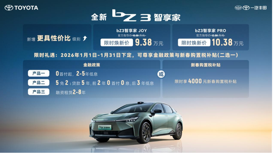 2025年12月31日,一汽丰田举办智电bZ双车焕新发布会;公布bZ3智享家JOY版和bZ3智享家PRO版限时焕新价分别为9.38万元和10.38万元。同时,在2026年1月1日-1月31日期间下定的用户,限时额外享4000元新春购置税补贴,或者包括0首付,2~5年低息;贷款5年,前两年0首付0息,后3年低息的“5免2”等在内的金融政策福利。