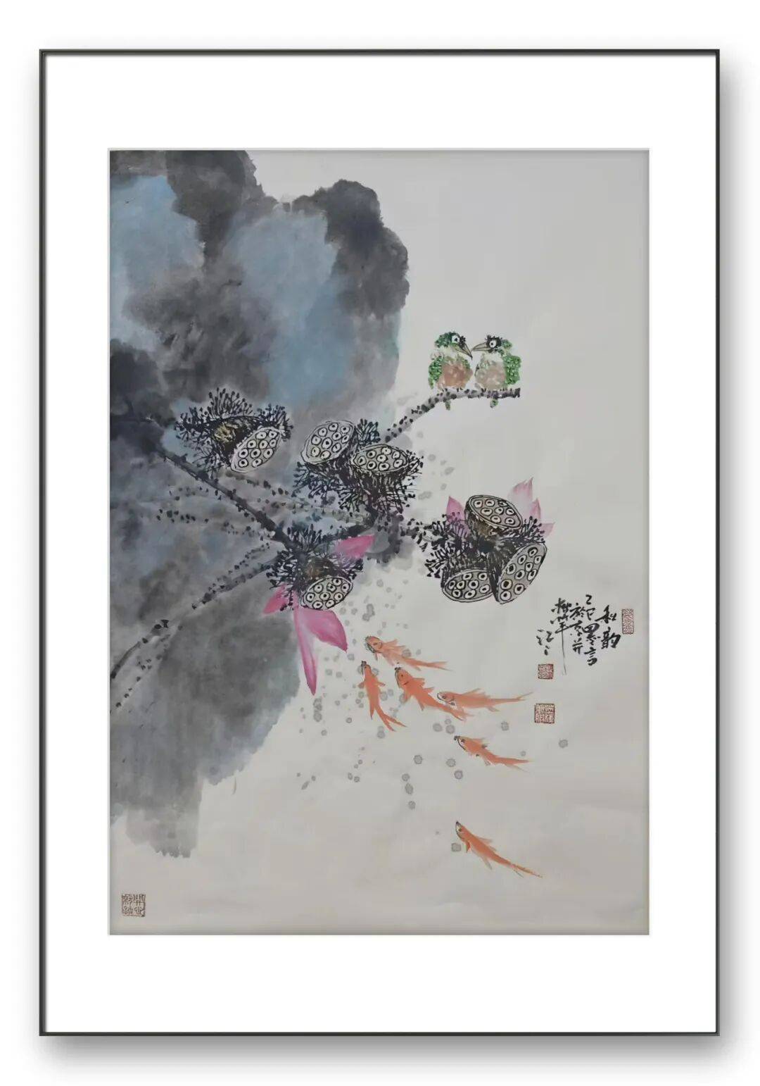 邵建刚先生的花鸟画,同样展现出深厚的传统功底与独特的艺术视角。他的花鸟画取法徐渭、齐白石等名家,注重笔墨的写意性与情感的表达,将花鸟的形态与神韵展现得栩栩如生。他擅长以简练的笔墨勾勒花鸟的轮廓,以浓淡变化的墨色表现花鸟的质感与层次,画面简洁而富有韵味,生动而不失雅致。他笔下的荷花,绝非对自然景观的简单复刻,而是经过艺术提炼后的精神写照。他善于搭配景致,或在荷塘中点缀几只游鱼,或在荷畔辅以几株水草,或用淡墨渲染远山碧水,让画面更显丰富饱满,意境悠远。在构图上,他既借鉴传统“留白”艺术,让画面留有想象空间,又融入当代审美视角,注重画面的平衡与张力。