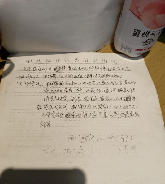 针对此事,当地基层组织曾介入核实:瓢井村村委会工作人员对参与过当年土地分配的李忠英、陈伍珍、申祥琴等知情人进行询问,相关笔录显示,该地块初始分配时,因薛永利家是 “最后一户”,结合人口、土地质量等因素,经集体同意后该地块权益归薛永利所有;村委会出具的《情况说明》也明确,该地块原始分配边界与薛永利的诉求一致。此外,瓢井镇政府曾多次组织调解,2014 年 6 月提出 “由吴德香补偿薛永利 12800 元” 的方案,吴德香方同意后,薛永利因对方案内容存异议未接受,调解无果。
