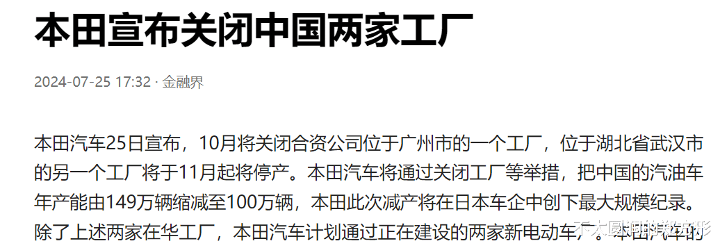 根据相关媒体的报道,本田汽车在7月25号宣布,为应对中国汽车品牌的竞争,将关闭和暂停两家中国工厂。